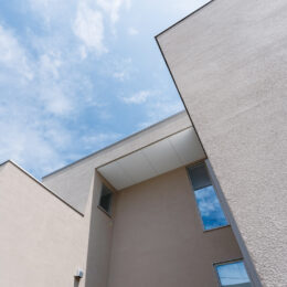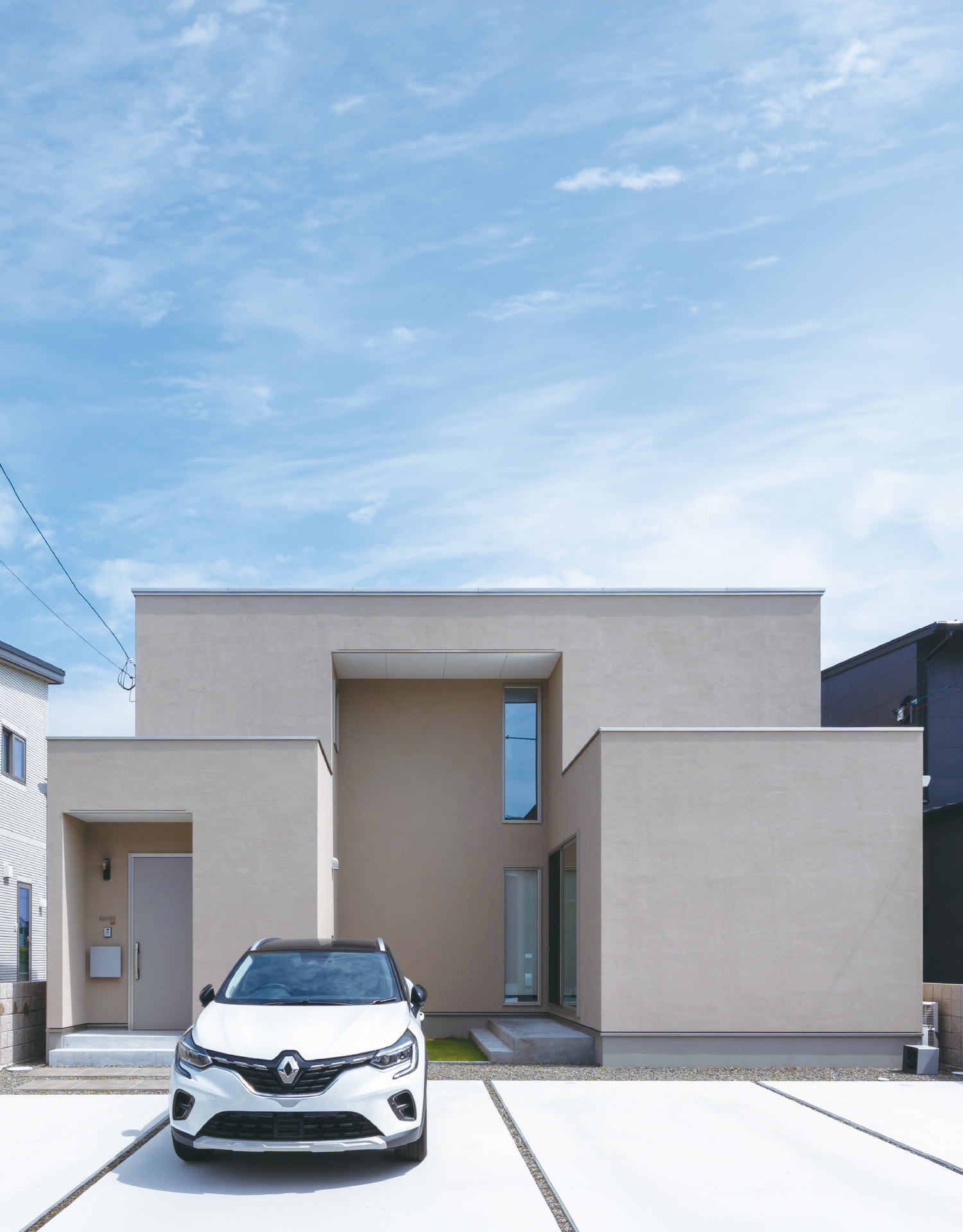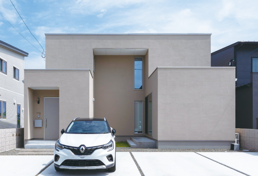 建物をコの字に配置することで、プライベートなお庭と十分な陽当たりを実現しました。オマケに駐車場は常時4台駐車可能。いつでも沢山のお客さんを呼べるとご友人の多いお施主様に大変喜んでいただきました。