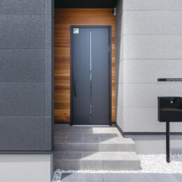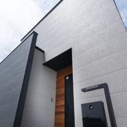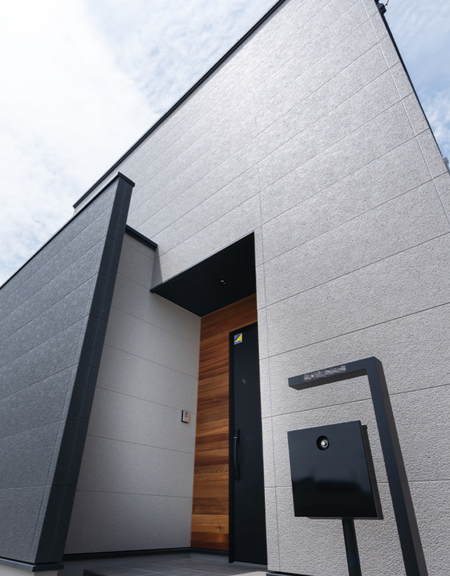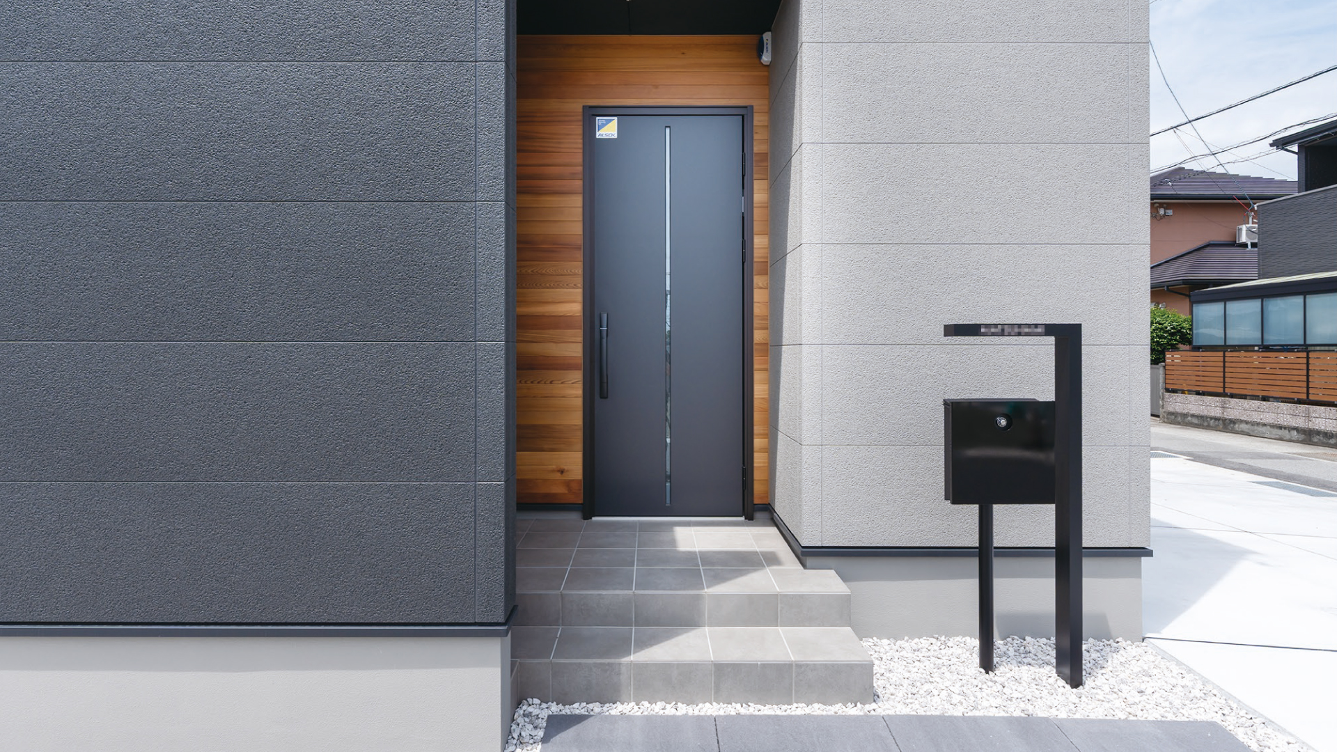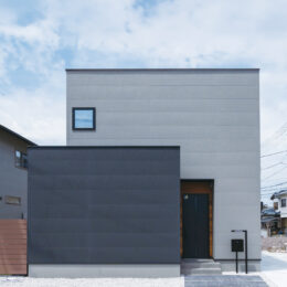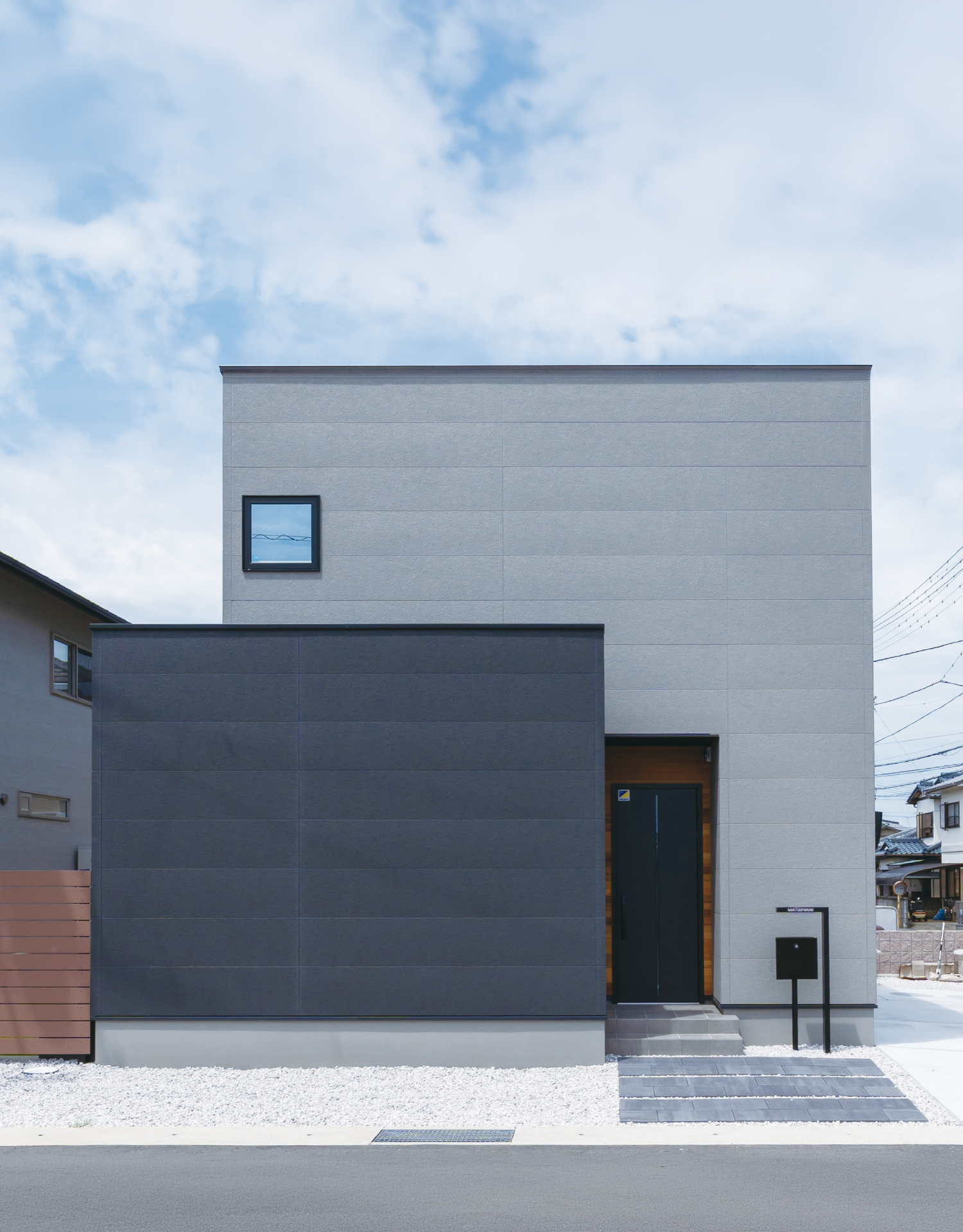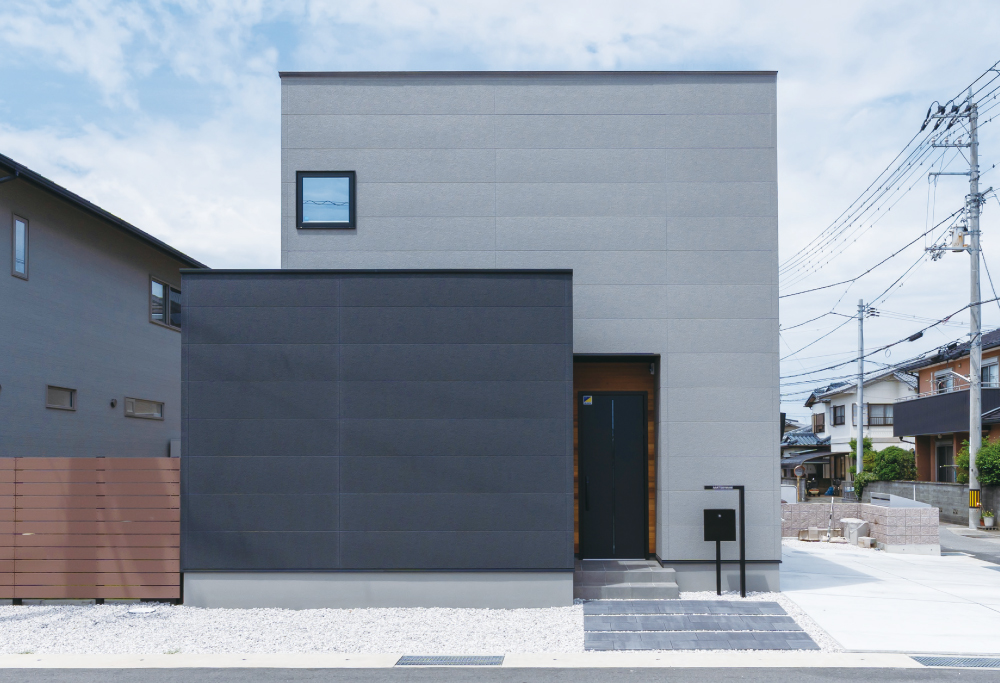 シンプルな外観がお好みのお施主様。洗練された見た目の中にも個性を出すために、ハコを組み合わせたおしゃれハウスに仕上げました。南側にはプライベートなお庭を取り、お休みの日は家族でBBQをしてお過ごしいただけます。